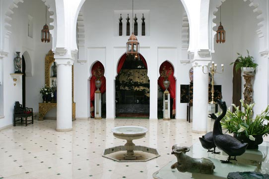 Autour d’un grand patio traditionnel et de sa fontaine, sous les arches et les dentelles de stuc, les salons se succèdent tous magnifiquement décorés :